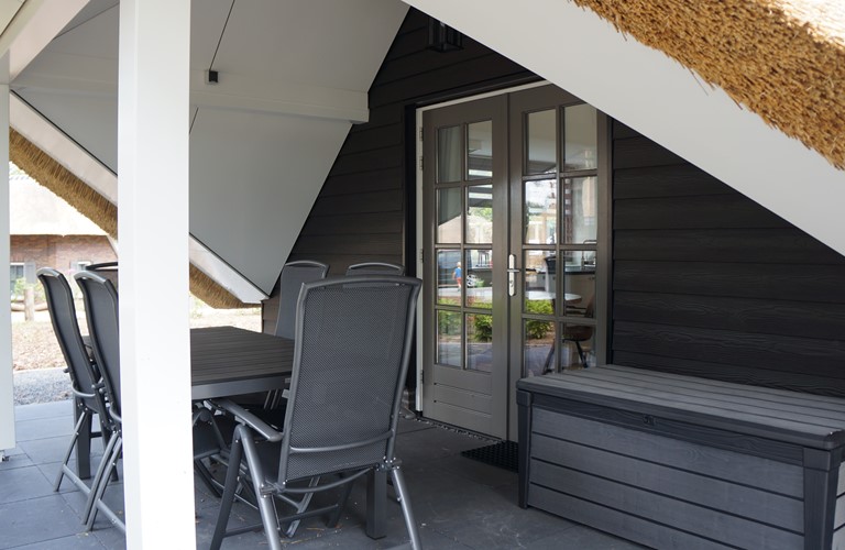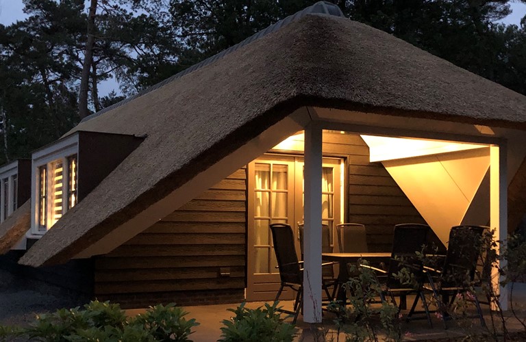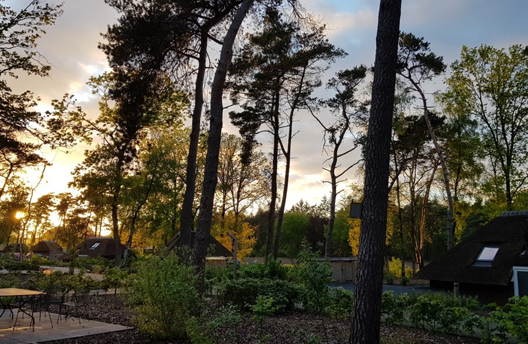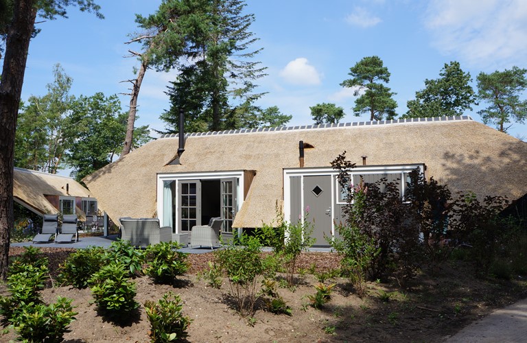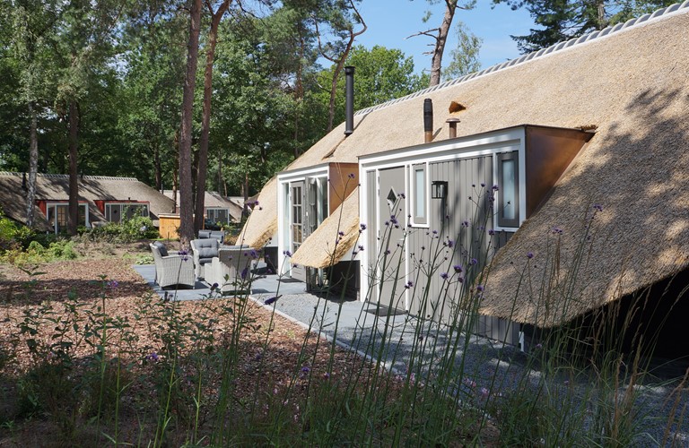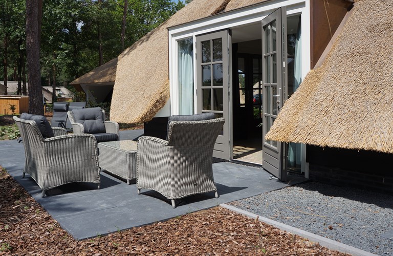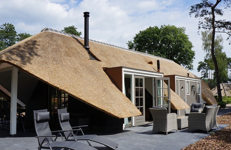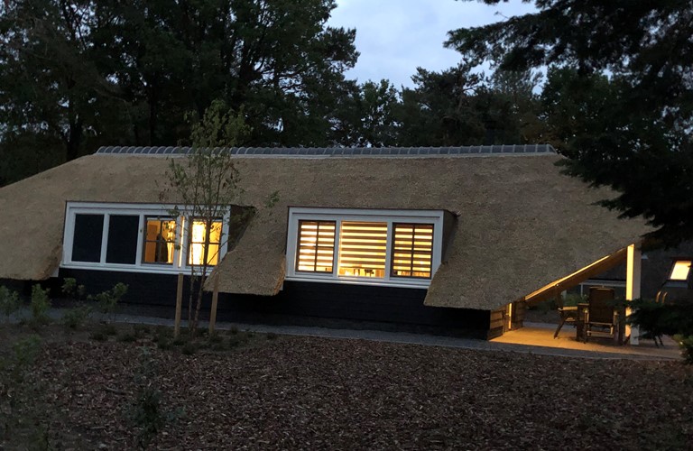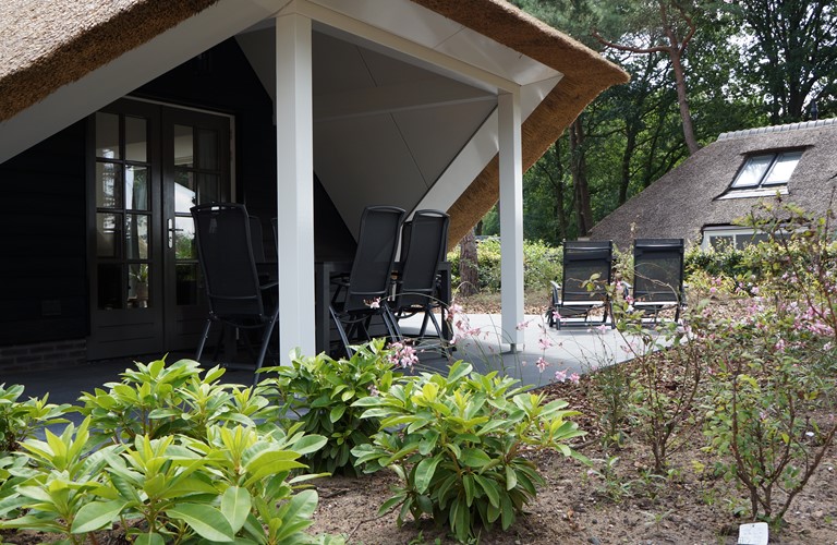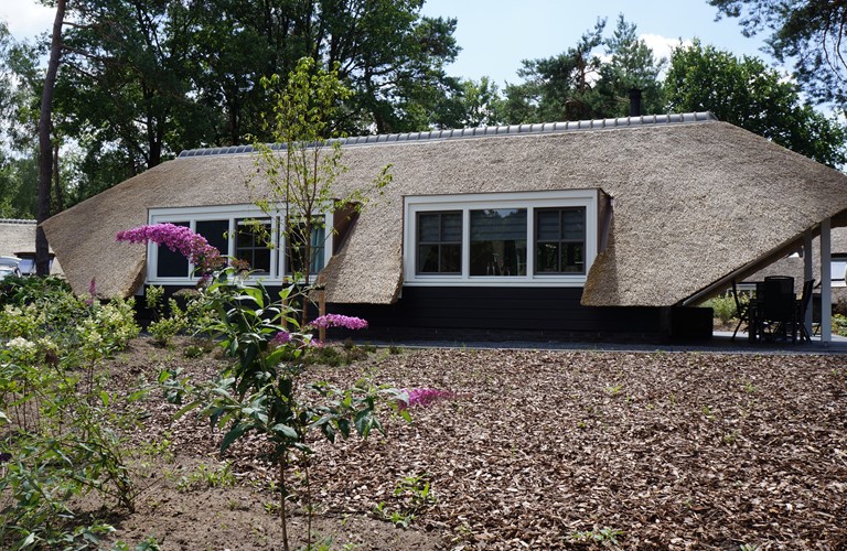 Rondom de woning is een prachtige bostuin aangelegd en op de terrassen staan comfortabele tuinmeubelen waarop u aan de zonnige zuidkant of onder de kap van het rieten dak heerlijk kunt ontspannen en genieten van de bossen en van de ondergaande zon.