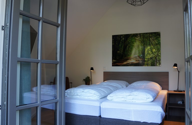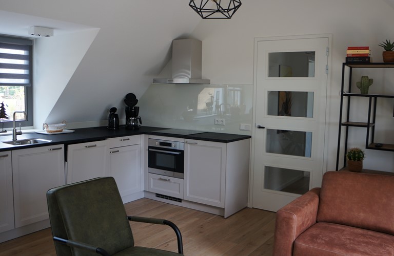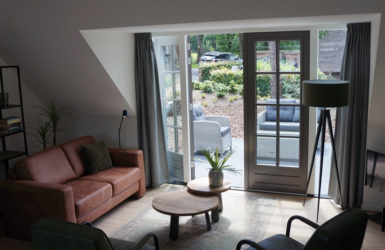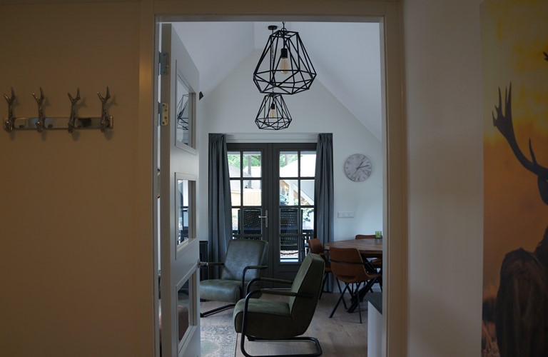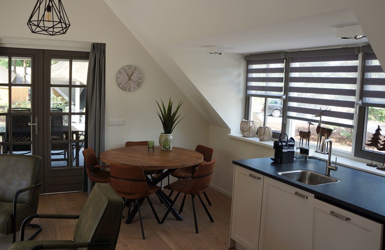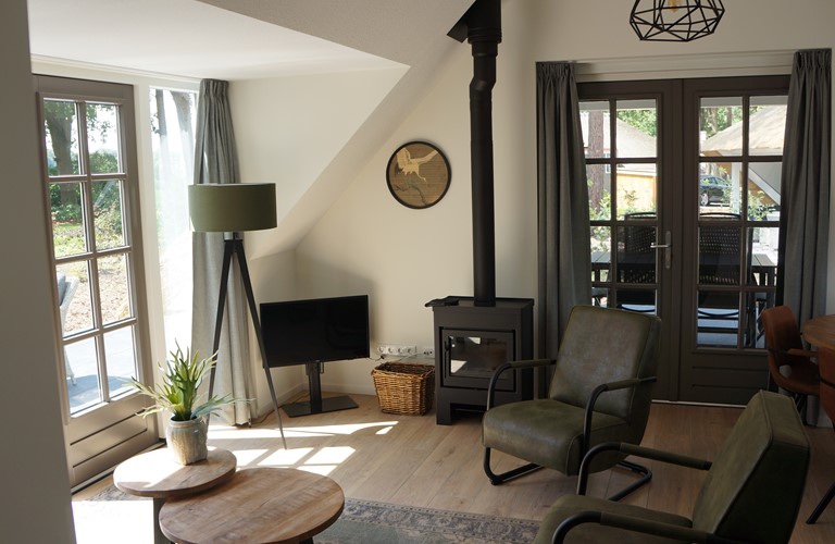 De woning is sfeervol en rustig ingericht, waarbij de kleuren van de bossen naar binnen zijn gehaald. De gehele woning heeft een houtlook tegelvloer en is van alle comfort en gemakken voorzien. De woonkamer heeft een heerlijke houtkachel en grenst aan de eethoek en de open keuken met natuurstenen blad. In de woning zijn twee tweepersoons slaapkamers, op één van de slaapkamers is een televisie. . De badkamer heeft een inloopdouche, er is een apart toilet.