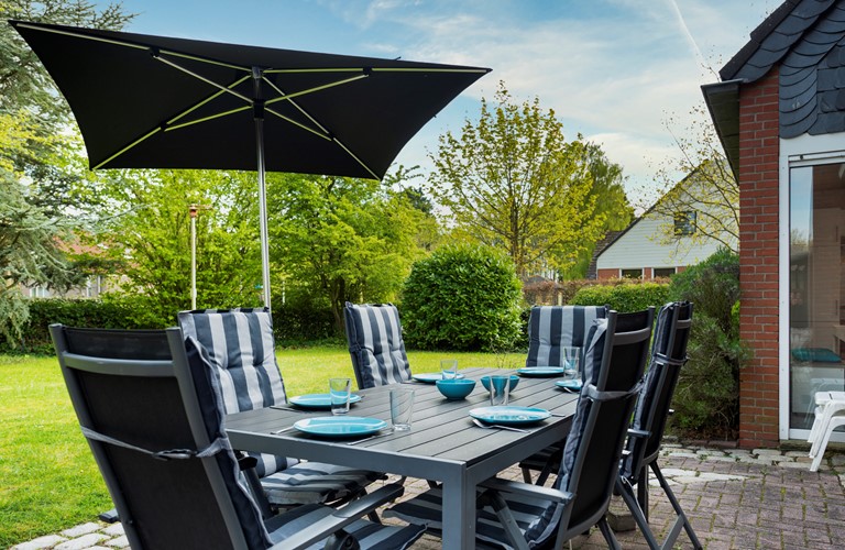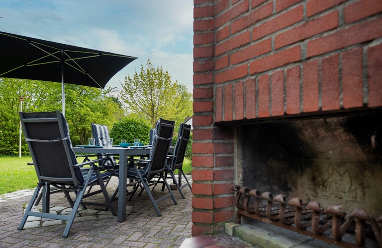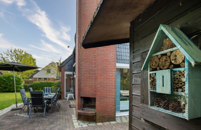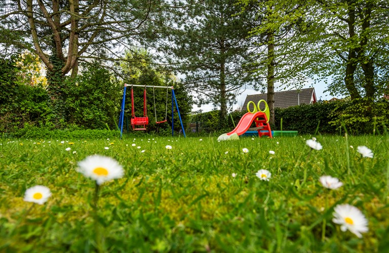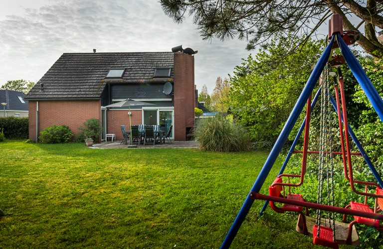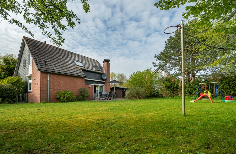 Vanuit de eetkeuken stapt u zo de volledig omheinde tuin in die is uitgerust met een terras, buitenhaard, grote eettafel, ligstoelen en een luifel. Ook is er een ruim gazon met een schommel, zandbak en glijbaan.