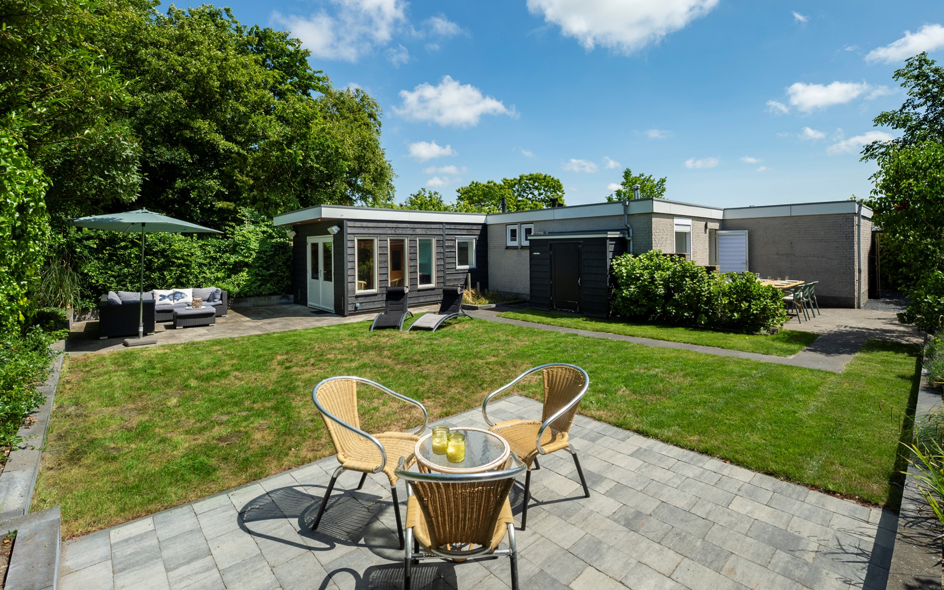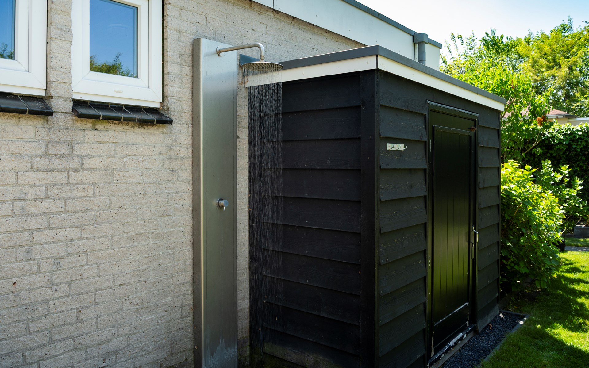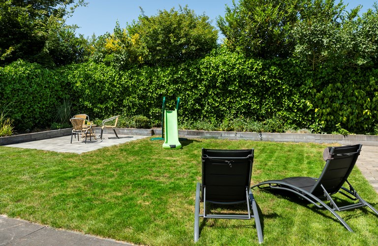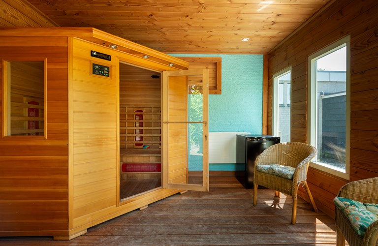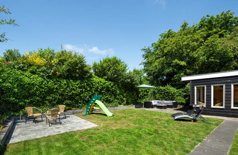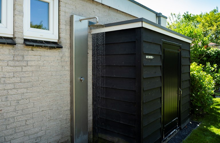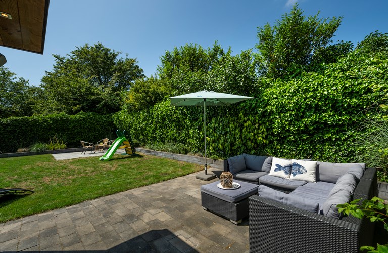 De ruime afgesloten achtertuin heeft twee terrassen met fijne tuinmeubelen en een heerlijke lounge waar u geniet van de zon en de muziek uit de speakers. Achter in de tuin bevindt zich een infrarood sauna in een aparte ruimte waar u heerlijk kunt zitten en ontspannen. Ook een luxe buitendouche is aanwezig. Verder zijn er een klein terras in de voortuin, twee parkeerplaatsen en een schuurtje te vinden.