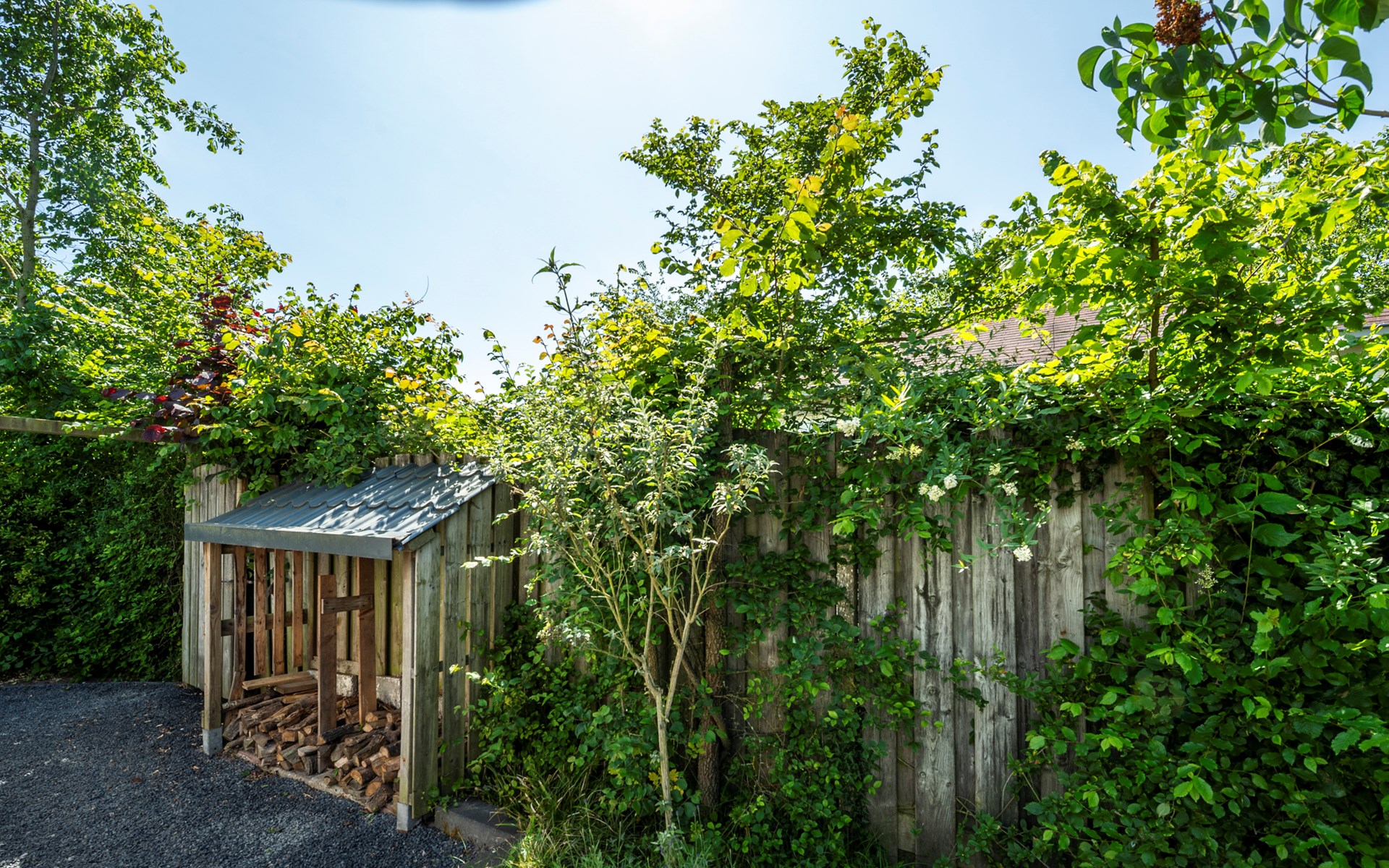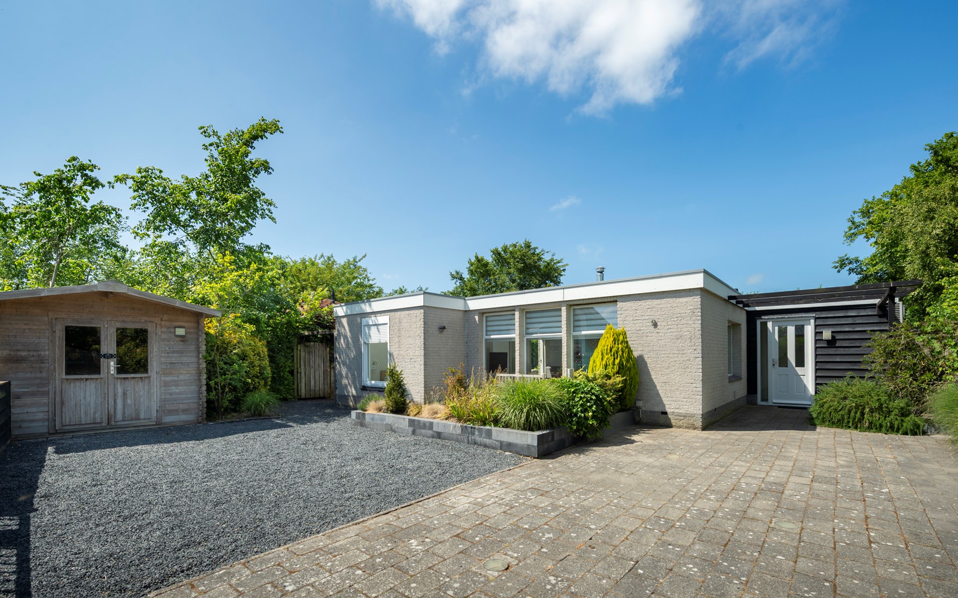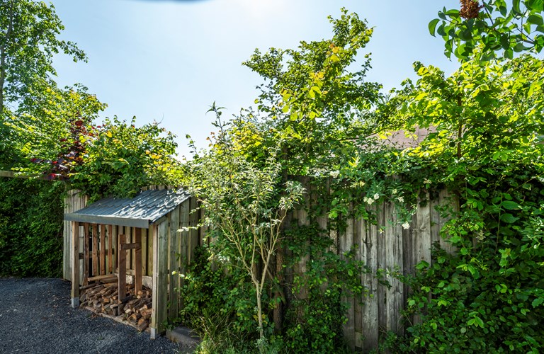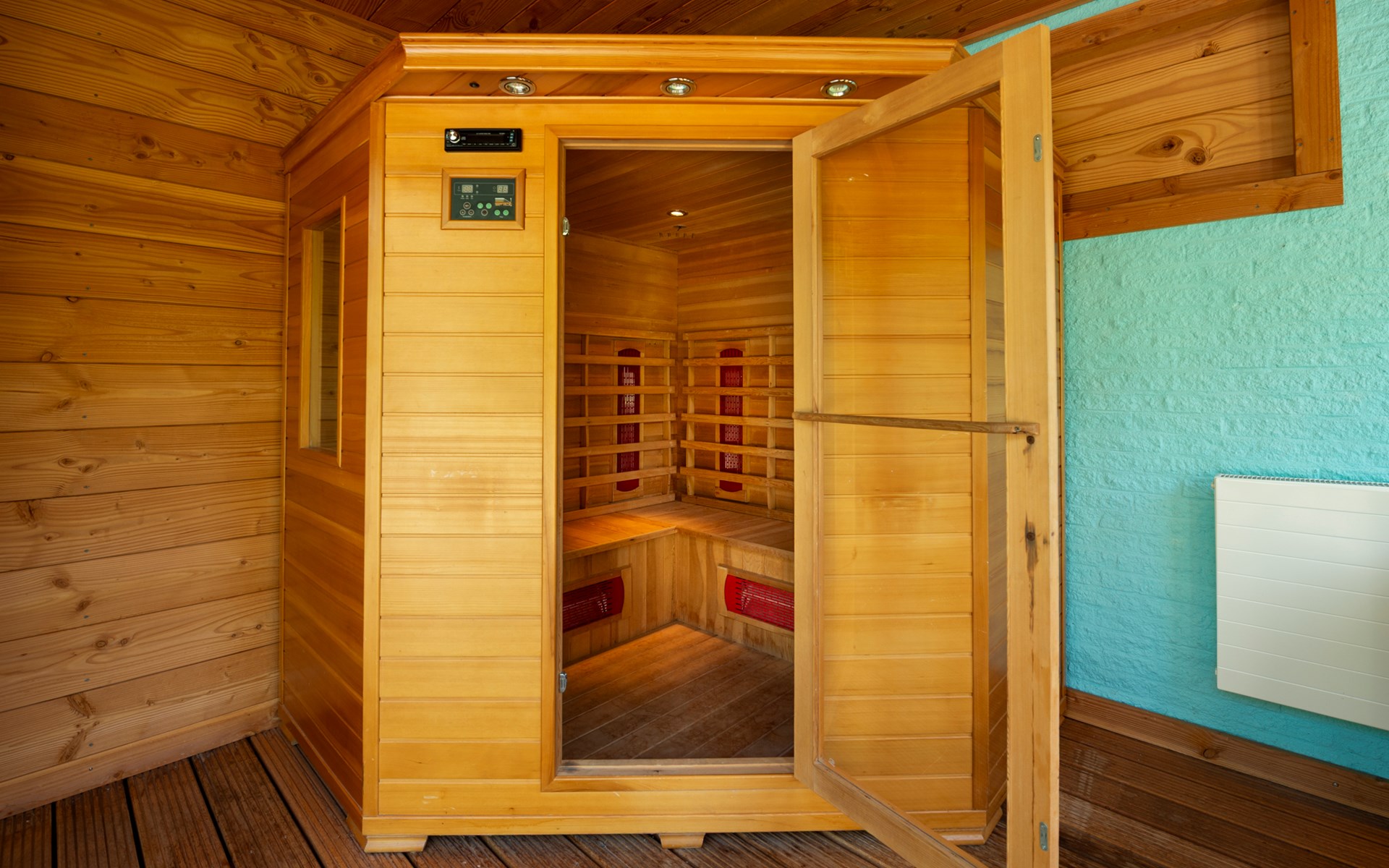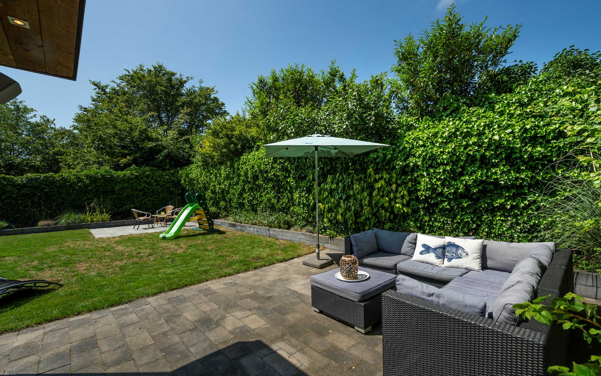 De ruime afgesloten achtertuin heeft twee terrassen met fijne tuinmeubelen en een heerlijke lounge waar u geniet van de zon en de muziek uit de speakers. Achter in de tuin bevindt zich een infrarood sauna in een aparte ruimte waar u heerlijk kunt zitten en ontspannen. Ook een luxe buitendouche is aanwezig. Verder zijn er een klein terras in de voortuin, twee parkeerplaatsen en een schuurtje te vinden.